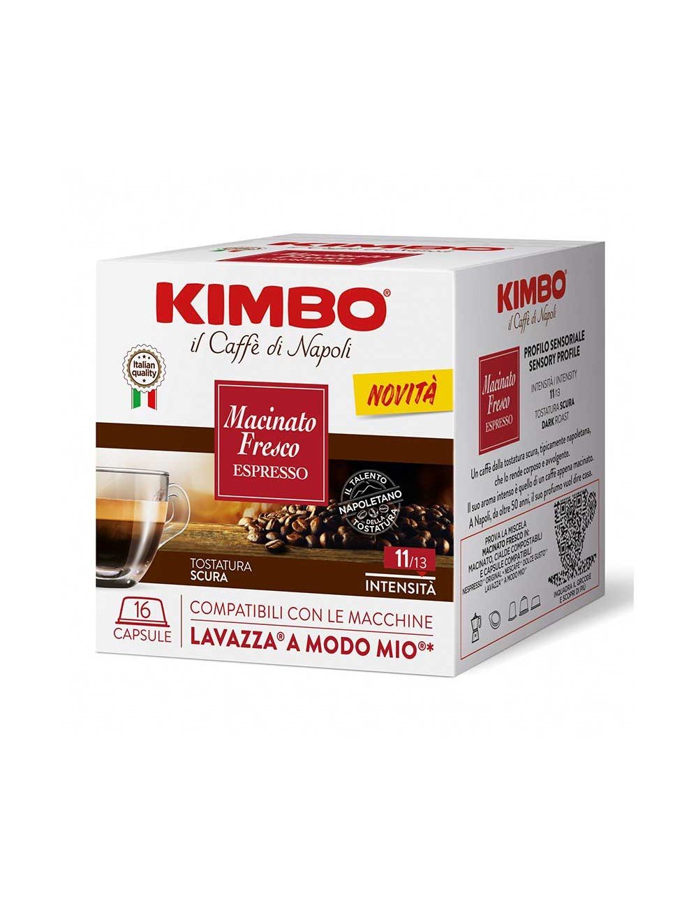 Κάψουλες Kimbo Macinato Fresco Συμβατές A Modo Mio 16 τεμάχια Μια επιλογή από εκλεκτούς καφέδες Arabica από την Κεντρική και Νότια Αμερική, ισορροπημένους με μια πινελιά Robusta από την Ασία. Ισορροπημένος, γεμάτος, γλυκός με ευχάριστες ανθικές νότες και νότες φρεσκοψημένων μπισκότων.
