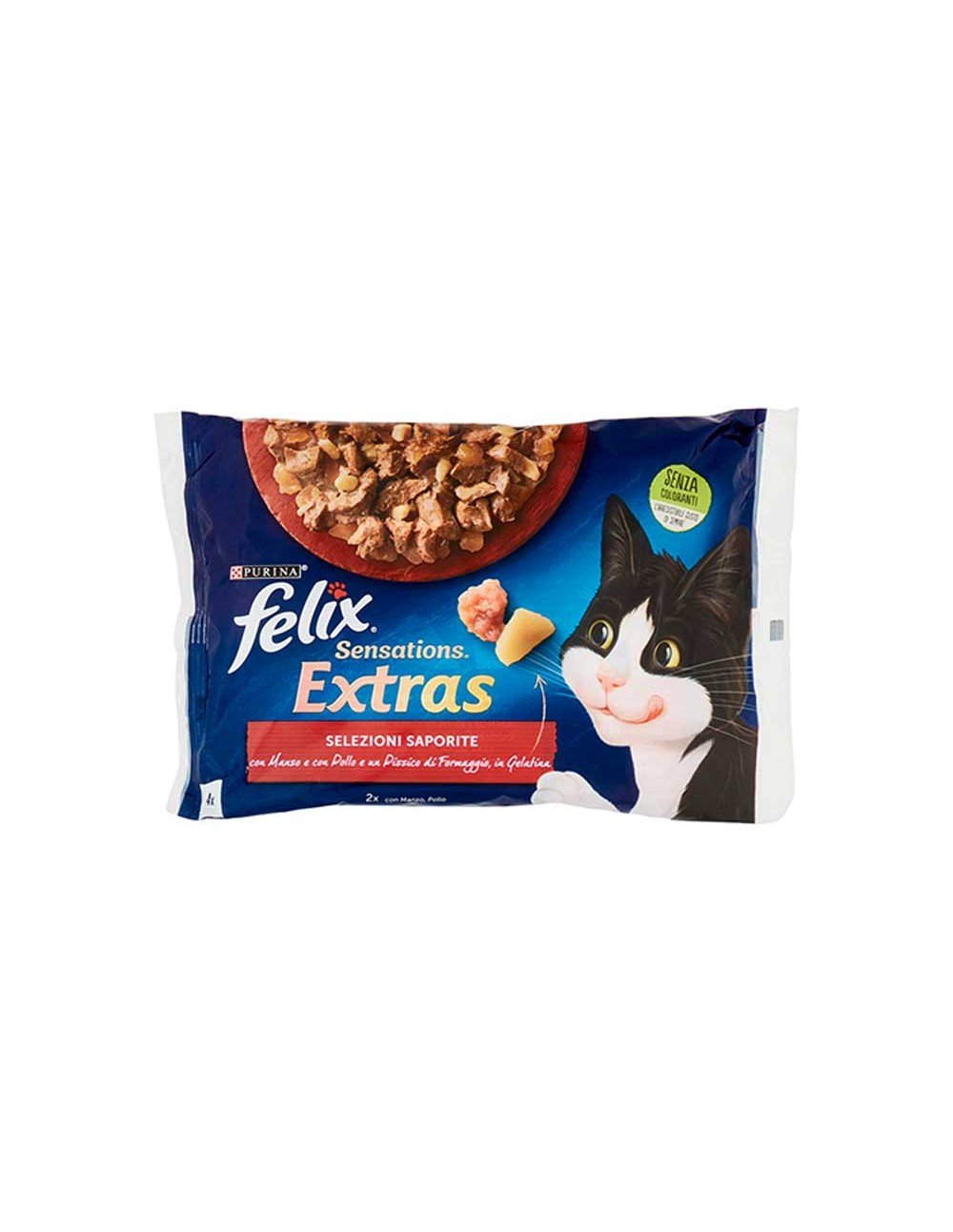Οι μονόποδες γάτες λατρεύουν να ανακαλύπτουν πάντα νέες γεύσεις! Το FELIX SENSATIONS Extras είναι μια σειρά από συνταγές που παρασκευάζονται με ποιοτικά συστατικά, οι οποίες έχουν εκπληκτική εμφάνιση, μυρωδιά και γεύση για τη γάτα σας. Κάθε συνταγή FELIX SENSATIONS Extras περιέχει τρυφερά κομματάκια με μια πρέζα νόστιμο τυρί ή μια πρέζα νόστιμο μπέικον: μια απροσδόκητη γεύση που η γάτα σας πρέπει να ανακαλύψει! Εκπλήξτε την σε κάθε γεύμα με υπέροχη γεύση!